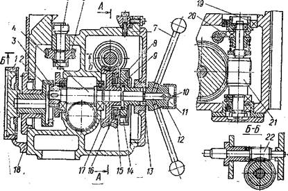 соединен со штангой 9, на которой закреплена вилка, охватывающая переключаемый тройной зубчатый блок. При повороте рукоятки 1