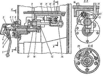 вследствие чего происходит опережение механической подачи. Ручное включение подач штурвалом осуществляют поворотом его в обратную сторону на 20° относительно реечного вала 4,