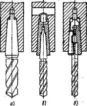 показано непосредственное закрепление сверла в коническом отверстии шпинделя, удерживаемого силой трения. Кроме того, инструмент имеет лапку, которая входит в паз шпинделя. В том случае, когда режущий инструмент имеет конический хвостовик малых размеров, необходимо пользоваться переходными коническими втулками (рис. 6, б).