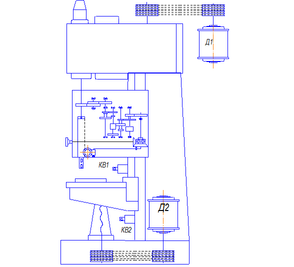 Для того, чтобы стол мог совершать автоматическое перемещение, ставим реверсивный электродвигатель Д2. Движение с вала ЭД за счет клиноременной передачи передается ходовому винту. Стол из конечного положения КВ2 перемещается в конечное положение КВ1. При реверсивном ходе двигателя стол совершает обратное перемещение из КВ1 в КВ2.
