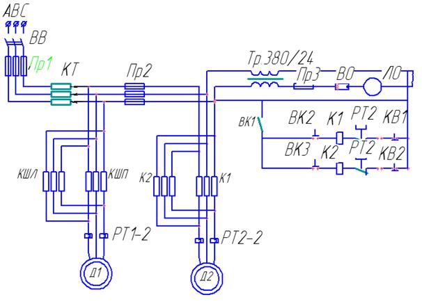 · Д1, Д2 – приводные АД с КЗ (короткозамкнутым)-ротором шпинделя и стола.