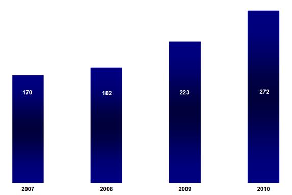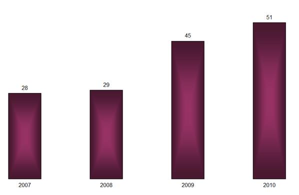 – показывает рост числа со 170 случаев, зафиксированных в 2007 г., до 272 случаев – в 2010 г., что более чем на 100 случаев больше (Рисунок 4).