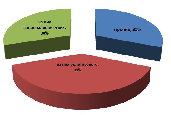 В настоящее время по искам прокуроров судами Российской Федерации запрещена деятельность 23 объединений, которые признаны экстремистскими, из них 9 религиозных, 7 националистических, что составляет 39% и 30% соответственно (Рисунок 5).