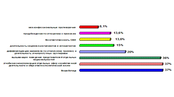 По данным Генеральной прокуратуры Российской Федерации по фактам разжигания межнациональной розни свыше 70% обвиняемых – молодежь. При этом наибольшее количество преступлений на почве межнациональной розни отмечается в Москве и Московской области, Санкт-Петербурге, Ставропольском крае, Нижегородской, Свердловской, Кемеровской, Тюменской и Новосибирской областях. С другой стороны, в ряде республик растет молодежь, имеющая смутное представление о своей большой родине[10]