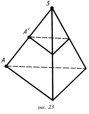 Доказательство. Пусть S — вершина пирамиды, А — вершина основания и А'— точка пересечения секущей плоскости с боковым ребром SA (рис. 23). Подвергнем пирамиду преобразованию гомотетии относительно вершины S с коэффициентом гомотетии