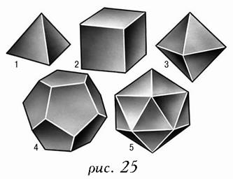 Существует пять типов правильных выпуклых многогранников (рис.25): правильный тетраэдр (1), куб (2), октаэдр (3), додекаэдр (4); икосаэдр (5).