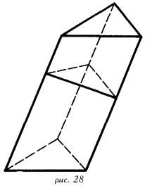 Плоскость проведенного сечения разбивает призму на две части (рис. 28). Подвергнем одну из них параллельному переносу, совмещающему основания призмы. При этом получим прямую призму, у которой основанием служит сечение исходной призмы, а боковые ребра равны l. Эта призма имеет ту же боковую поверхность, что и исходная. Таким образом, боковая поверхность исходной призмы равна рl.