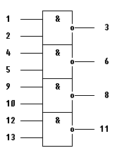 1,2,4,5,9,10,12,13 - входы X1-X8; 3 - выход Y1; 6 - выход Y2; 7 - общий; 8 - выход Y3; 11 - выход Y4; 14 - напряжение питания;