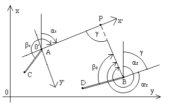 При построении плана при точках А и В с помощью транспортира строят углы 1 и 1 и в пересечении линий получают изображение точки 1 на плане. Аналогично находят на плане положение точки 2.