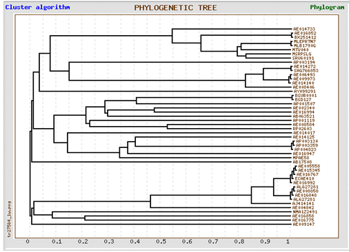 При помощи программы Alibee (http://www.genebee.msu.su/services/malign_reduced.html) было построено общее выравнивание всех найденных последовательностей генов белка S7, а также участков между генами S12 и S7. При помощи этой же программы было построено филогенетическое дерево бактерий (Рис. 2, 3).