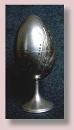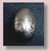 «Яйцо-сюрприз» Москва. 1908–1917 гг. Фирма Карла Фаберже. Мастер Фёдор Афанасьев? Серебро, резьба, золочение. 6,3 х 4,2. Клейма: ФА., Фаберже, Московского окружного пробирного управления — женская головка в кокошнике, обращённая вправо с шифром «дельта», 84. Пост. Из Центрального музея МВД СССР, 1988. [Приложение 6]