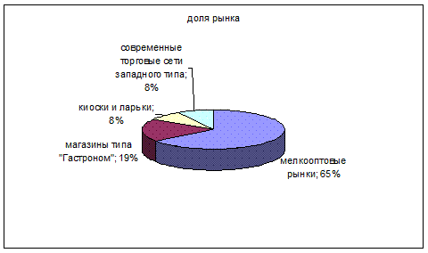 Рассмотрим розничную торговлю. Согласно исследованиям консалтинговой группы «МакКинси», в Российской Федерации доля мелкооптовых рынков составляет 65% розничного товарооборота, магазинов типа «Гастроном» — 19%, киосков и ларьков— 8%, современных торговых сетей западного типа— 8%. Причем доля торговых сетей велика только на рынке бытовой техники и электроники, на рынках других товаров она составляет не более 1%.