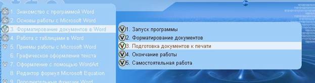5. Выбрать раздел 3. Форматирование документов в Word, пункт 3. Подготовка документа к печати.