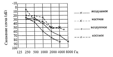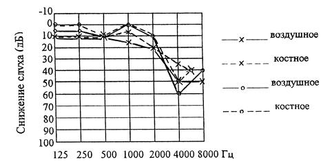 У лиц летного состава ГА также наблюдаются случаи выявления ПНСТ. Козиным О.В. (1979, 1981, 1983) впервые была выявлена зависимость изменений чувствительности звукового анализатора у лиц летного состава ГА от возраста и стажа летной работы. Так, с увеличением стажа летной работы, а вместе с тем и длительности воздействия авиационного шума на орган слуха, у лиц летного состава имеется тенденция к динамическому повышению средних тональных порогов. Наибольшее снижение слуховой функции наблюдалось у лиц старше 40 лет и при стаже работы более 15 лет. При этом средние пороги слуха у пилотов оказались значительно ниже, чем у промышленных рабочих в аналогичных группах стажа. У лиц летного состава с НСТ в стажевых группах 15-19 лет и 20-24 года средние пороги слуха на частотах 4000 и 8000 Гц соответствуют I-II степени тугоухости, согласно критериям оценки слуха по классификации Остапкович В.Е., Пономаревой Н.И. (1979). В отличие от наземных работников шумовых производств во всех группах стажа у них пороги слуха на частотах 125, 250 и 500 Гц не превышали возрастных уровней. Таким образом, врачебно-летная экспертиза проводится и с целью раннего выявления вредного воздействия авиационного шума на лиц летного состава. Поэтому, при медицинском освидетельствовании лиц летного состава врач оториноларинголог ВЛЭК должен учитывать требования приказа Минздрава России № 90 от 14.03.96 "О порядке проведения предварительных и периодических медицинских осмотров работников и медицинских регламентах допуска к профессии". Это означает, что: а) при вынесении медицинского заключения необходимо указать этиологию НСТ или обозначить: "НСТ неясной этиологии". Следует обязательно учитывать сопутствующие заболевания (церебральный атеросклероз, гипертоническая болезнь и т.д.). Это особенно касается случаев впервые установленного диагноза НСТ на фоне многолетнего наблюдения пилота по поводу этих заболеваний. Достаточно часто впервые отмеченное снижение слуховой функции, квалифицирумое как НСТ, у таких лиц может входить в симптомокомплекс указанной патологии, характеризуя ее развитие. Такая НСТ может расцениваться как вторичная, отличающаяся клиническими проявлениями и по времени развития от хронической ПНСТ шумовой этиологии, что может подтверждаться отсутствием длительно воздействующего интенсивного шума (летное время за период наблюдения);