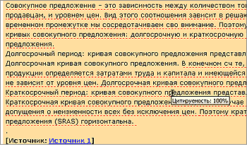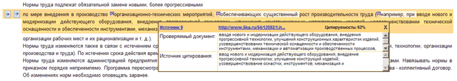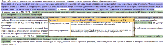 Щелчок мышью по цитированному фрагменту выводит окошко с указанием источника. В случае частичного цитирования в этом окошке также выводятся сопоставленные фрагменты (из проверяемого документа и из источника) для более удобного сравнения.