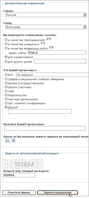 Процедура регистрации состоит в следующем: вначале Вы заполняете поля анкеты. Поля, отмеченные звездочкой, являются обязательными к заполнению – если они останутся незаполненными, Сервис не продолжит процедуру регистрации.