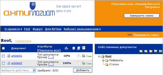 Ваш кабинет пользователя служит для организации и хранения папок и документов, а также для доступа к таким функциональным возможностям системы, как загрузка текстов и документов для проверки степени их оригинальности, просмотр сгенерированных системой отчетов и других сервисов.