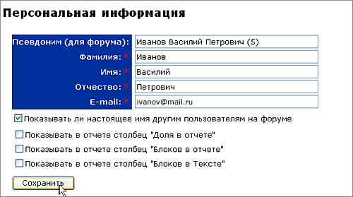 (ФИО, e-mail, ник на форуме): в Кабинете пользователя щелкните по ссылке «Профиль»; в поле «Персональная информация» введите новые данные, выполните необходимые настройки отображения отчета; нажмите на кнопку «Сохранить».