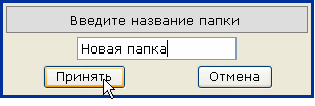 Название текущей папки подчеркнуто и выделено полужирным шрифтом. Если папка выделена таким образом, то все Ваши действия по удалению, добавлению, переименованию подпапок и загрузке файлов будут происходить именно в ней. Путем нажатия на соответствующую иконку на панели работы с собственными документами возможно выполнение следующих операций над папками: добавление ( ), удаление ( ), перемещение ( ), переименование ( ), обновление папок ( ). Кнопка «Обновить» ( ) служит для обновления содержимого всей страницы. Для создания подпапки в выбранной папке нажмите иконку «Добавить» ( ). В появившемся окне введите названия новой папки и нажмите на кнопку «Принять».