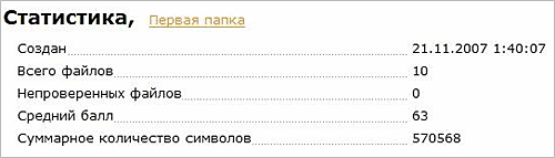 Также имеется возможность просмотра статистики по каждой папке. Статистика содержит информацию о дате создания папки, количестве находящихся в ней файлов, количестве непроверенных