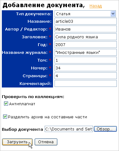 После заполнения полей формы и выполнения всех необходимых настроек, нажмите на кнопку «Загрузить». Документ будет отправлен в систему на обработку. Щелкните по ссылке «Назад», чтобы перейти в пользовательский кабинет, где в обновленном списке будет находиться только что загруженный Вами документ.