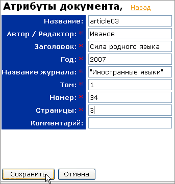 Затем нажмите на кнопку «Добавить». После чего отобразится форма загрузки документа. При добавлении документа или нескольких документов необходимо заполнить соответствующую форму, содержащую поле переключения типа документа «Книга/Статья/Студенческая работа», и набор полей, зависящий от выбранного типа. Поля, обязательные для заполнения, помечены «звездочкой».