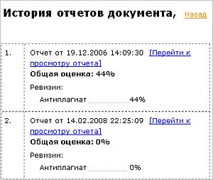В Истории проверки документа ( ) отображается информация: количество и даты проверок, итоговые оценки, а также ссылки на отчеты по датам проведения проверок.