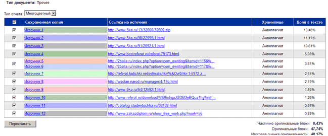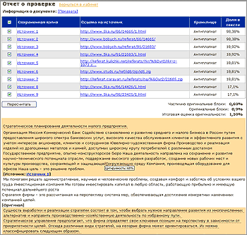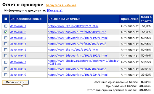 оригинальности документа вычисляется из соотношения объема оригинального текста к объему заимствованного и указывается под таблицей источников. Чтобы перейти к просмотру отчета, нажмите иконку «Отчет» ( ) справа от названия документа в кабинете пользователя. Все источники перечисляются в виде ссылок на сохраненные копии. Одновременно с этим для каждого источника указывается URL страницы в Интернете, откуда он был загружен. Если Вы хотите проследить в документе какой-либо конкретный источник цитирования, отметьте его галочкой и нажмите на кнопку «Пересчитать