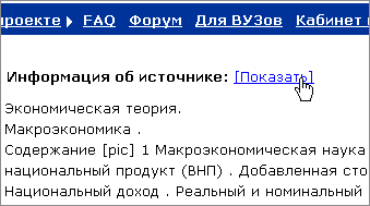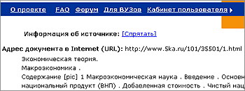 Внизу такого текстового блока, указывается ссылка на сохраненный источник цитирования, при переходе по которой Вы автоматически позиционируетесь на соответствующем месте источника (там, где находится цитированный фрагмент). Адрес источника в Интернете, а также иную имеющуюся о нем информацию, Вы можете посмотреть, пройдя по ссылке [Показать] вверху источника.