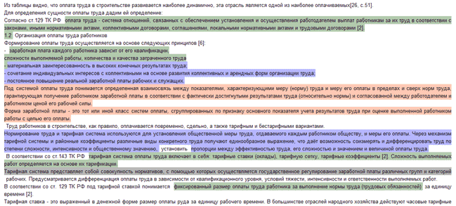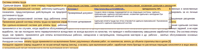 Блоки исходного текста, найденные в документах базы данных системы (источниках цитирования), выделяются цветовым фоном. Оригинальные части текста цветом не помечаются.
