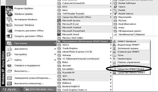 : Главное меню (меню Пуск) > Программы > Программное обеспечение SMART Board > Средства SMART Board