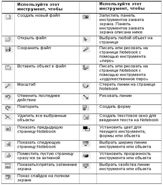 Панель инструментов Notebook позволяет вам создавать учебные занятия и презентации, а так же управлять ими и корректировать. По умолчанию панель инструментов появляется вверху страницы Notebook. Если вы хотите работать сидя,то либо предполагается, то панель инструментов можно переместить вниз страницы (для этого, нажав и удерживая пустой участок на панели инструментов, передвиньте ее вниз).