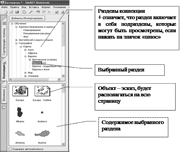 Объекты коллекции делятся на два вида: объекты - эскизы, занимающие всю область рабочего листа и объекты – рисунки.