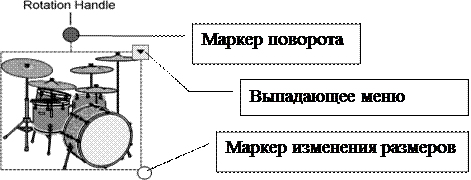 Удерживая нажатой левую кнопку мыши на маркере изменения размеров, и перемещая маркер в нужном направлении, будет изменяться размер объекта.
