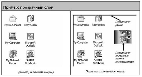 Если вы возьмете маркер с лотка, то появится перемещаемая панель инструментов и рамка вокруг рабочего стола. Появившаяся рамка означает, что вы можете писать прямо на рабочем столе либо поверх файла, открытого в данный момент, и остается до тех пор, пока вы не положите маркер или ластик обратно на лоток и не коснетесь доски. Ваше первое прикосновение к доске удалит рамку и все ваши записи.