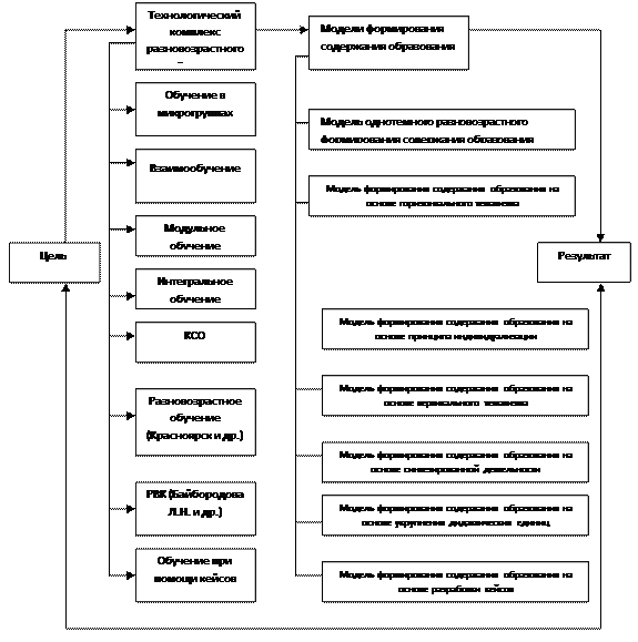 Технологический комплекс разновозрастного обучения состоит из ряда различных образовательных технологий и моделей обучения. К числу технологий можно отнести наиболее применяемые в МКШ Сибирского региона: модульное, интегральное (В. В. Гузеев и др.), разновозрастное (А. А. Остапенко и др.), проектное обучение, КСО (В. К. Дьяченко и др.), обучение при помощи кейсов (А. П. Тряпицина и др.), в ходе межвозрастного взаимодействия (Л. Н. Байбородова и др.). Этот перечень можно продолжить, так как практически любая из современных образовательных технологий может быть использована в условиях разновозрастного класса-комплекта (как, например, различные варианты развивающего обучения). К числу моделей обучения, широко распространенных в РФ, можно отнести взаимообучение, обучение в микрогруппах и др.
