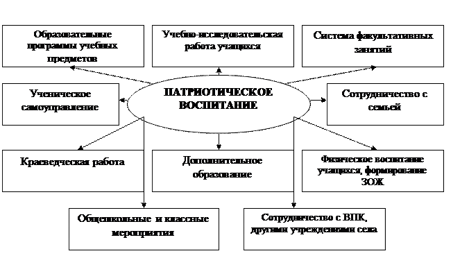 Таким образом, очевидна необходимость создания модели и технологии патриотического воспитания учащихся. Эта модель должна включать в себя методическую базу воспитательной деятельности и комплекс мероприятий по формированию патриотических чувств и сознания молодых граждан РФ. Поэтому заслуживает целенаправленного аналитического анализа и экспериментальной апробации проблема содержания, методов и средств учебно-воспитательной деятельности в сельской школе, направленных на решение задач патриотического воспитания.