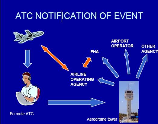 Он/она должен как можно раньше до прибытия информировать авиадиспетчерскую службу (ATC) о любых случаях, свидетельствующих о наличии заболевания инфекционной природы или риска для здоровья людей на борту. Авиадиспетчерская служба должна передать эту информацию немедленно или как можно скорее компетентным органам для данного аэропорта прибытия в соответствии с процедурами, установленными ММСП (2005), Статья 28.4 и Процедурами ICAO для аэронавигационных служб – Управление воздушными перевозками (PANS-ATM, Документ ICAO PANS-ATM 16.6), как показано на Рисунке 1 и в Блоке 2.