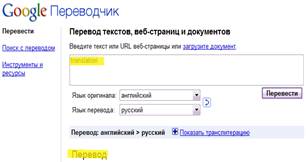 – оnline-переводчик поисковой системы google, позволяющий осуществить двусторонний перевод лексем, словосочетаний, идиоматических выражений с\на 51 язык. http://translate.google.com.by