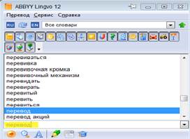 Самой распространенной, на наш взгляд, является программа ABBY Lingvo. Обновленная версия12 содержит девять рабочих языков, помимо словарных статей, программа имеет акустический словарь, что позволяет получить не только графический, но и акустический образ нужного слова. Перевод можно осуществить не только введя слово непосредственно в поле программы и нажав , как показано на рисунке 3, но также, открыв любое приложение и наведя курсор мыши на интересующее слово. Вдобавок к этому программа позволяет просмотреть формы слова и получить примеры его употребления[5], зачастую взятые из художественных текстов, что, без сомнения, несет в себе и образовательную нагрузку.