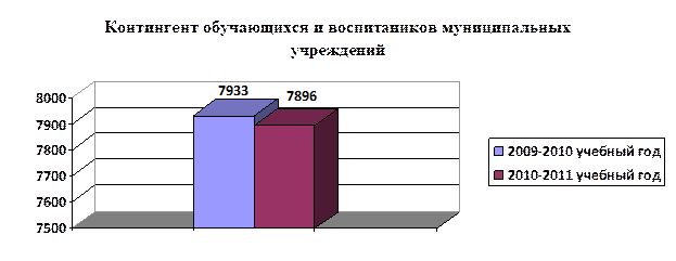 В 2011/2012 учебном году общий контингент обучающихся и воспитанников муниципальных учреждений составил 7 896 человек, что на 37 чел. (0,5%) меньше, чем в 2010 году, в т. ч.