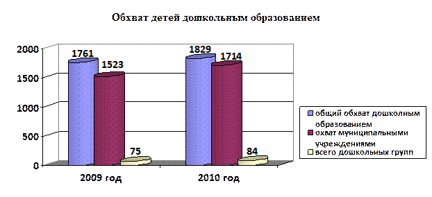 В системе дошкольного образования работало 84 группы, с общим охватом 1829 ребенок, в т. ч. посещали муниципальные учреждения 1714 ребенка. В 2009 году -75 групп с общим охватом детей 1761 чел, в. т. ч. посещали муниципальные учреждения 1523 ребенка. По району в 2010 году отмечается процесс увеличения охвата детей дошкольным образованием на 10,7 %. Средняя наполняемость групп в ДОУ в 2010 году составила 20,4 ребенка, в 2009 году – 20,3.