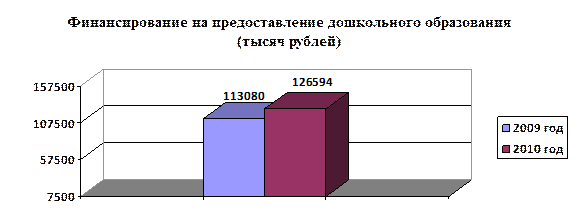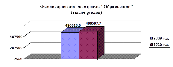 Финансирование по отрасли «Образование» в 2010 году составило 499597,7 тыс. рублей (2009 год – 480615,6 тыс. рублей). Отмечается увеличение финансирования на 3,8%.