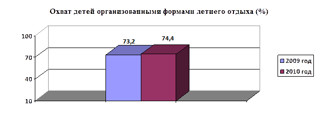 В 2010 году всеми организованными формами летнего отдыха было охвачено 4 859 детей и подростков, что составляет 74,4 % от общего числа школьников без учёта учащихся 9, 11 классов (2009 г. -73,2 %).