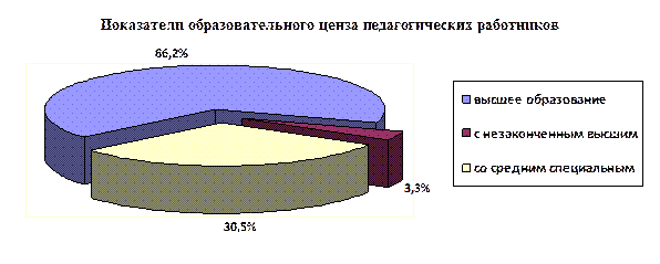 Улучшаются показатели образовательного ценза педагогических работников. С высшим образованием в системе образования района работают 382 педагога, что составляет 66, 2%, с незаконченным высшим – 19 чел. (3,3%), со средним специальным – 176 чел. (30,5%). Увеличилось число педагогов с высшим педагогическим образованием до 86,1%, в тоже время отмечается постепенное сокращение числа педагогов со средним профессиональным образованием до 24 %.