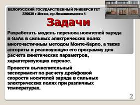 2. Разработать модель переноса электронов в нелегированном GaAs в сильных электрических полях на основе многочастичного метода Монте-Карло.