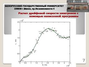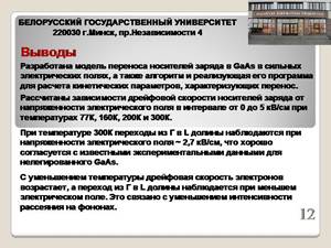 Целью работы является разработка модели переноса электронов в нелегированном GaAs в сильных электрических полях, разработка соответствующего алгоритма и реализующей его программы для расчета кинетических параметров, характеризующих перенос, и проведение вычислительного эксперимента по расчету дрейфовой скорости электронов в нелегированном GaAs в сильных электрических полях многочастичным методом Монте-Карло.