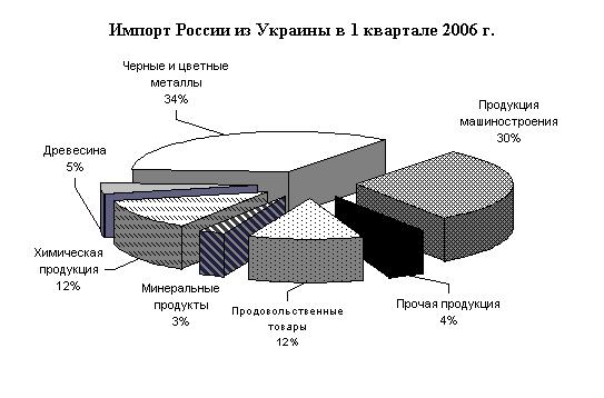 В российском экспорте в Украину, как и прежде, главенствуют минеральные продукты (нефть, газ), которых в 1 квартале 2006 г. поставлено на 2,4 млрд. долл. США. Доля этой группы в общем объеме экспорта в Украину составила 65%. В 2005 году ОАО "Газпром» поставил Украине в счет оплаты транзита около 23 млрд. куб. м российского газа. Машиностроительная продукция является второй по значимости статьей экспорта в Украину – свыше 498,6 млн. долл. США. В этой группе товаров наибольший рост был в экспорте электрических машин и оборудования (на 40%) и транспортных средств (на 70%). Экспорт черных и цветных металлов в Украину составил 274,4 млн. долл. США, что на 25% больше, чем за отчетный период 2005 года. 58,7% экспорта в этой группе составили черные металлы (161,1 млн. долл. США). Экспорт меди составил 22,5 млн. долларов США, что почти в 2 раза больше, чем за аналогичный период 2005 года. Экспорт химической продукции вырос на 32,2%. Экспорт фармацевтической продукции составил 8,2 млн. долларов США (рост на 28,1%). Экспорт удобрений вырос почти в 3 раза - до 49,9 млн. долларов США. Древесины и целлюлозно-бумажных изделий в 1 квартале 2006 года Россия экспортировала на 35,8% больше, чем в 1 квартале 2005 г. Экспорт бумаги и картона вырос на 45,4% до 57 млн. долларов США. Экспорт продовольственных товаров и с/х сырья вырос на 30%. На 37,1% вырос экспорт изделий из мяса и рыбы. На 52,6% вырос экспорт жиров и масел животного и растительного происхождения. Поставки в Украину продуктов переработки овощей и плодов уменьшились на 76,2%. Поставки табака и его заменителей уменьшились на 10%, молока и молочных продуктов увеличились на 59%. Ведущими статьями в импорте России являются машиностроительная продукция, черные и цветные металлы, продовольственные товары. Импорт машин, оборудования, транспортных средств из Украины вырос на 9,5% и составил в 1 квартале 2006 года 509,7 млн. долл. США. Импорт средств наземного транспорта увеличился в 2,2 раза и составил 71 млн. долл. США. Импорт черных и цветных металлов в процентном выражении увеличился на 46% и составил 583,6 млн. долл. США. Импорт в этой группе, несмотря на действие ограничительных мер, введенных Россией в отношении украинских швеллеров, некоторых видов стальных труб, прутков из железа и стали, в 2 раза превышает российский экспорт в Украину. Продовольственных товаров ввезено на сумму 201,5 млн. долл. США, падение темпов роста на 27%. Импорт украинского продовольствия в Россию более чем в 2 раза превысил российский экспорт. Импорт химической продукции вырос на 33,5%, древесно-целлюлозной на 11%. Темп роста импорта кожаных изделий вырос на 21%, текстиля, текстильных изделий – вырос на 46%. Существенную роль для экономик обеих стран играют поставки продукции по кооперации. В кооперационных поставках участвуют свыше 300 предприятий с обеих сторон. Поставки в 2005 году осуществлялись по 1250 позициям из Украины в Российскую Федерацию и по 1780 позициям из Российской Федерации в Украину. В кооперационных поставках участвуют в основном предприятия машиностроения, оборонно-промышленного комплекса, авиастроения, химической промышленности, черной металлургии и легкой промышленности. Около 90% взаимных поставок по кооперации приходится на промышленно развитые восточные регионы Украины. Снятию барьеров во взаимной торговле содействовало вступление в силу со 2 февраля 2006 года графика отмены изъятий из режима