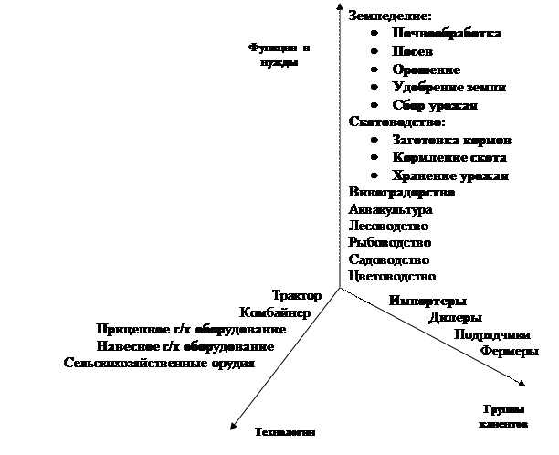 Полезным инструментом для понимания базового рынка является модель, предложенная Абелем и Хаммондом (Abel and Hammond “business domain”). На трех осях графика отображаются функции или нужды (т.е. описание того, что получают клиенты от приобретения продукта организации), технологии (на основе каких технологических процессов, используемых организацией, осуществляется выполнение функций), а также клиенты или группы клиентов. На графике отображается как рынок в целом, так и область деятельности компании.