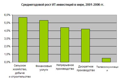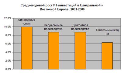 Характерно, что зеркально эта ситуация наблюдается и на региональных рынках. Так, в Центральной и Восточной Европы темпы роста промышленных инвестиций в ИТ также уступают показателям финансового и телекоммуникационного секторов. Минимальные темпы роста наблюдаются в дискретном и непрерывном производстве (средний показатель ежегодного роста в 2001–2006 гг. - 8,7%). Более активно автоматизируются восточноевропейские строительные и добывающие предприятия - 9%.